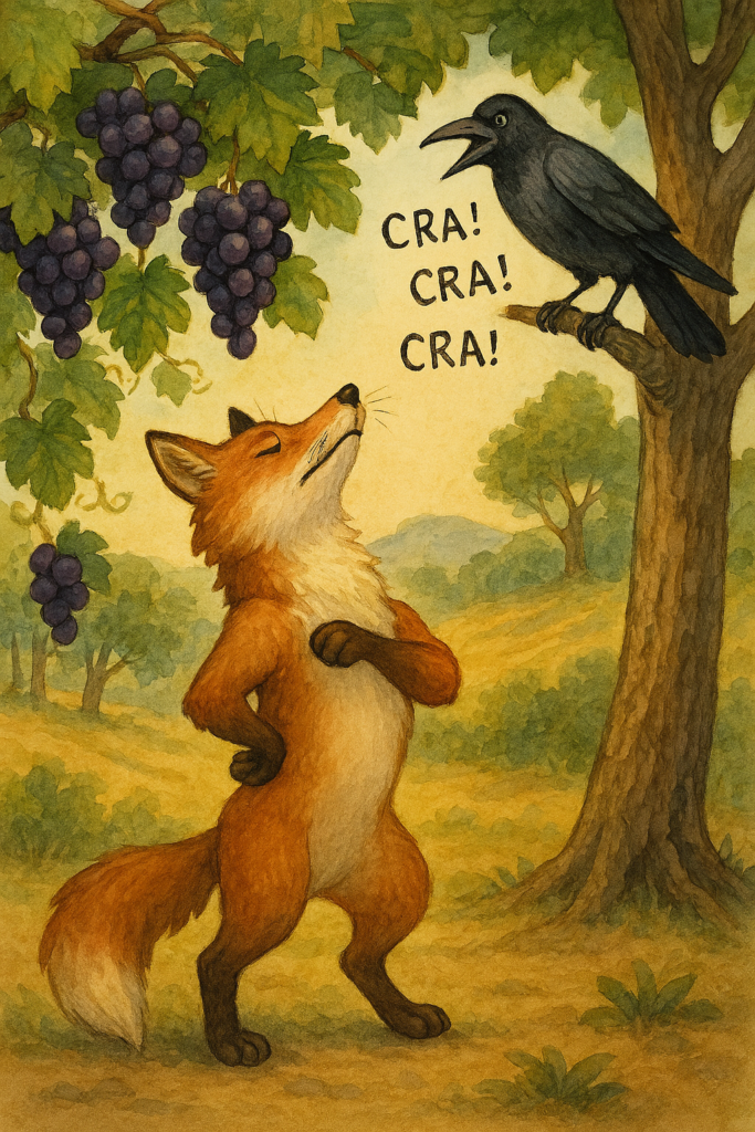 In questo articolo leggiamo una versione semplice e moderna della famosa favola La volpe e l’uva. La storia racconta di una volpe molto furba che, un giorno, arriva in un vigneto perché ha molta fame. Quando vede dei bei grappoli d’uva, prova a prenderli, ma sono troppo alti. La favola ci aiuta a riflettere sul comportamento umano. Alla fine, ci invita a pensare a come reagiamo quando non riusciamo a ottenere ciò che desideriamo.